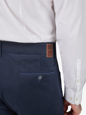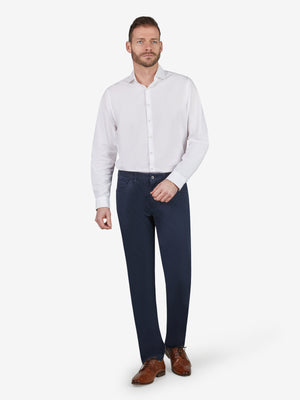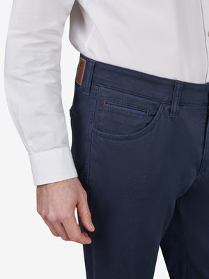 Comfortabele swing pocket met elastische comfort tailleband en overhemdstopper. Het dubbele muntzakje met paspel geeft de look een sportieve touch. Gemaakt van een bi-elastische katoenen twill met microstructuur. Gewicht: 405 g/rm Het model heeft een normale stijging en een slanke pijp met een smalle voetwijdte.